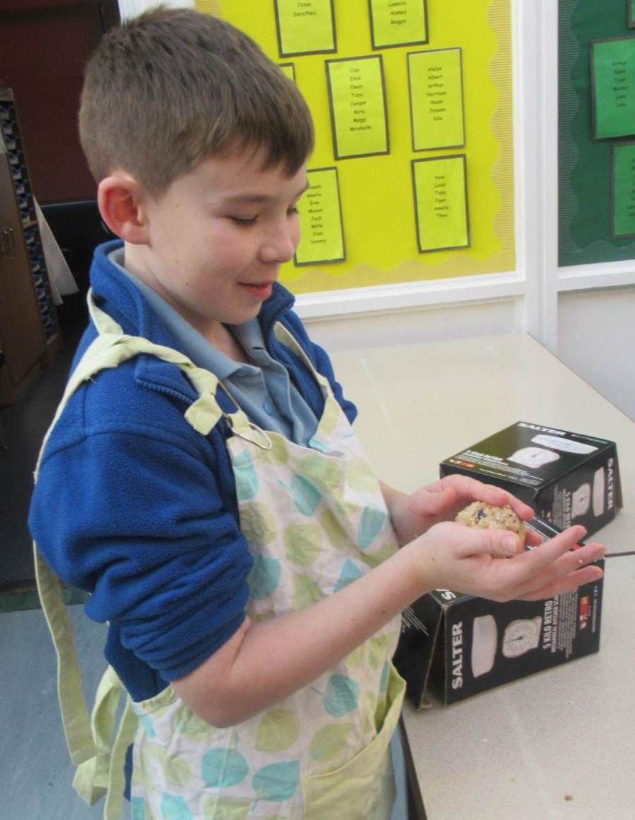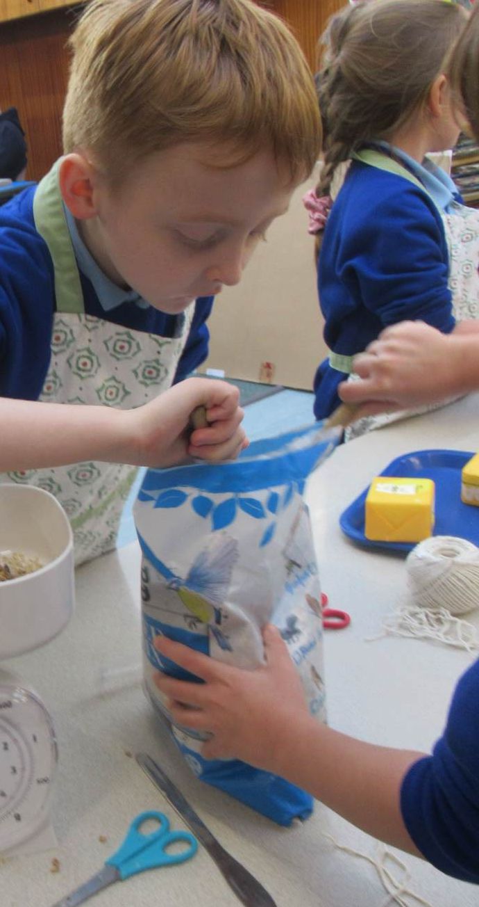They make bird feeders and hang them on the trees just outside the music room. The children then complete the survey by observing the different types of birds that they see and the results are then sent to RSPB.